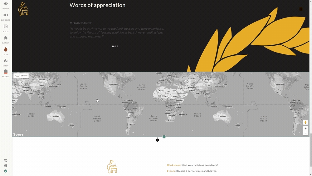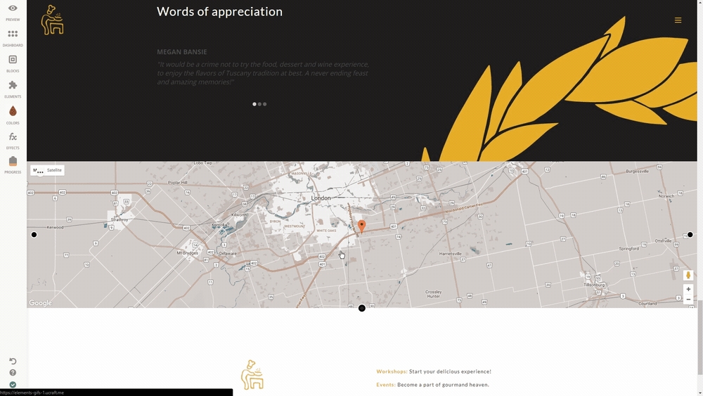 You need your business to be easily found by your site visitors, that's why we've got a Map Element. All you need to do is add the ‘Map’ Element from the Elements section to the Crafting Area and edit it.