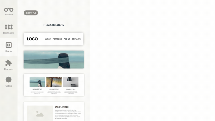 Alternatively, you can also add pre-designed blocks from Blocks section. Just choose the Block type and drag and drop it on your Header or Footer area.
